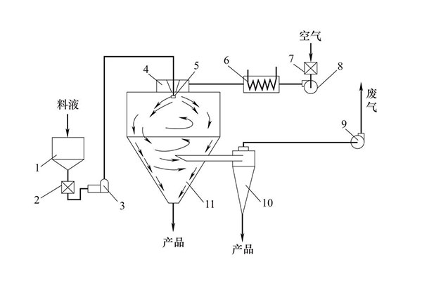 1—料液貯罐;2—料液過濾器;3—送料泵;4—熱風分布器;5—霧化器;6—空氣加熱器;7—空氣過濾器;8—鼓風機;9—引風機;10—旋風分離器;11—噴霧干燥器