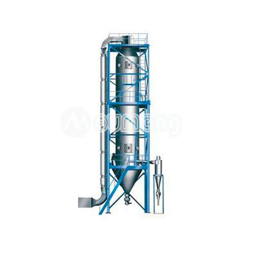 壓力噴霧干燥機是一種可以同時完成干燥和造粒的裝置。按工藝要求可以調節料液泵的壓力,流量,噴孔的大小,得到所需的按一定大小比例的球形顆粒。其工作過程為料液通過隔膜泵高壓輸入,噴出霧狀液滴,然后同熱空氣并流下降,大部分粉粒由塔底排料口收集,廢氣及其微小粉末經旋風分離器分離,廢氣由抽風機排出,粉末由設在旋風分離器下端的授粉筒收集,風機出口處還可裝備二級除塵裝置,回收率在96-98%以上。其與物料接觸部分的塔體、管道、分離器的材料,均采用SUS304制作。在塔體內部與外殼之間有足夠的保溫層,填充材料為超細玻璃棉,塔體設有觀察門、視鏡、光源及控制儀表,由電氣控制操作臺控制和顯示。其熱源裝置采用蒸汽加熱或電加熱器,具有操作方便、啟動快、結構緊湊、熱風干凈清潔等優點。另外在電氣控制柜內裝有電加熱器的控制調節裝置,使進口溫度無級調節。對于缺電地區可采用蒸汽加熱或燃煤、燃油熱風爐等方式,局部或全部代替電加熱裝置。